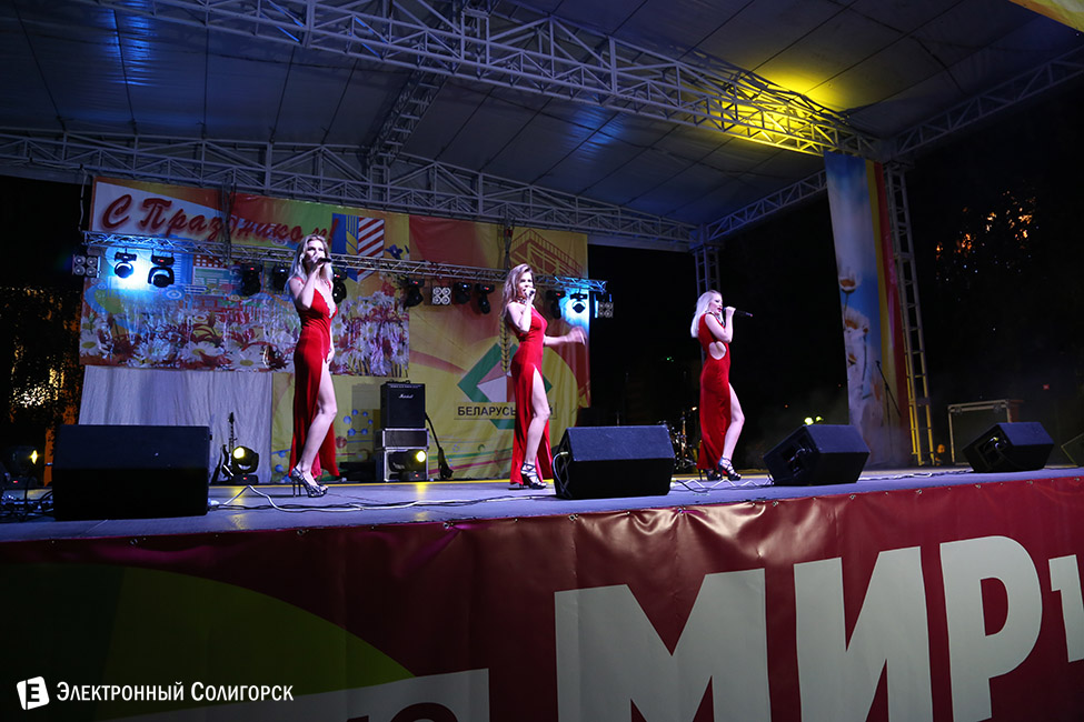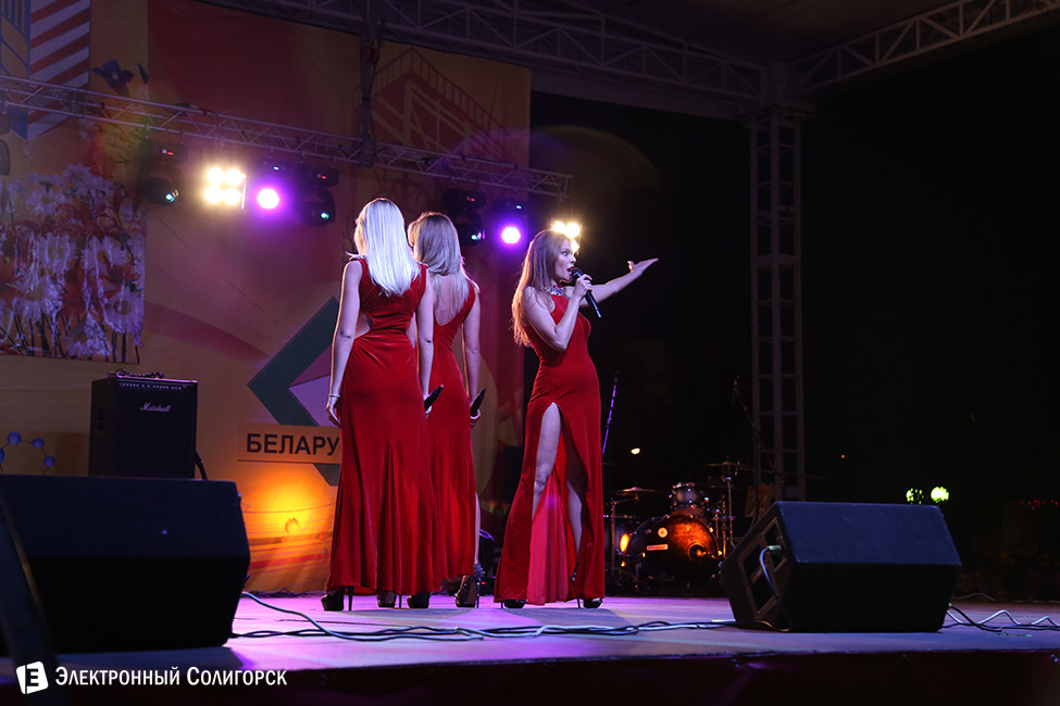 А дальше было продолжение концерта. Музыкальным подарком с городом делился ОАО "Беларуськалий", подготовивший концертную программу. И вновь соблазительное трио, но на этот раз уже другое - девушки из группы "Топлесс" в интригующих красных платьях продолжили стали эффектным продолжением праздника.