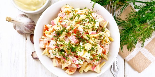 Нарежьте крабовые палочки, перец и помидоры небольшими полосками. Добавьте к ним тёртый сыр и измельчённый чеснок. Заправьте салат майонезом и украсьте укропом.