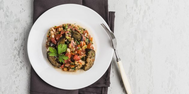 Нарежьте баклажаны и помидоры мелкими кубиками. Добавьте к ним мелко нарезанный лук, сок целого лимона, рубленую петрушку, измельчённый чеснок, соль и оставшееся масло и перемешайте.