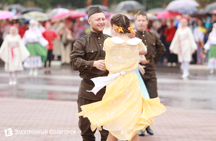 Затем события переместились в центр города. Начавшийся дождь не смог помешать проведению красочного праздничного шествия на улице Ленина. Хотя многим зрителями участникам шествия пришлось вооружиться зонтиками.