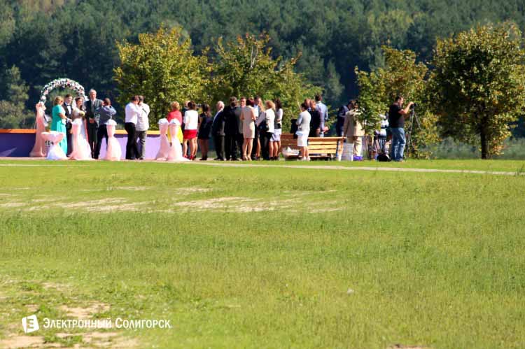 Куда обычно отправляются солигорчане-молодожёны после ЗАГСа? Традиционно у всех новоиспечённых супругов примерно одинаковый маршрут - сначала возложение цветов к одному из мемориалов, затем фотосессия в живописных уголках нашего города и района, ну, и как конечный пункт назначения, ресторан. После завершения благоустройства солигорского Детского пляжа у наших молодожёнов появился ещё один вариант, куда можно отправиться, выйдя из Дворца бракосочетаний: говорят, на автостоянке близ водохранилища в последнее время всё чаще можно наблюдать свадебные кортежи. Вот и корреспонденту "Электронного Солигорска" случайным образом посчастливилось стать свидетелем праздника под открытым небом. Молодожёны принимали поздравления от немногочисленных гостей прямо на берегу водоёма. Место проведения торжества оформлено соответственно случаю.