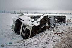 На обочине дороги неподалеку от Слуцка фотокорреспондентом "Электронного Солигорска" сегодня около полудня была запечатлена занимательная картина последствий недавних снегопадов - лежащая на боку фура. Занимательным, а не пугающим этот факт делает то, что транспортное средство, как оказалось, в таком положении находилось к тому моменту последние полтора дня.