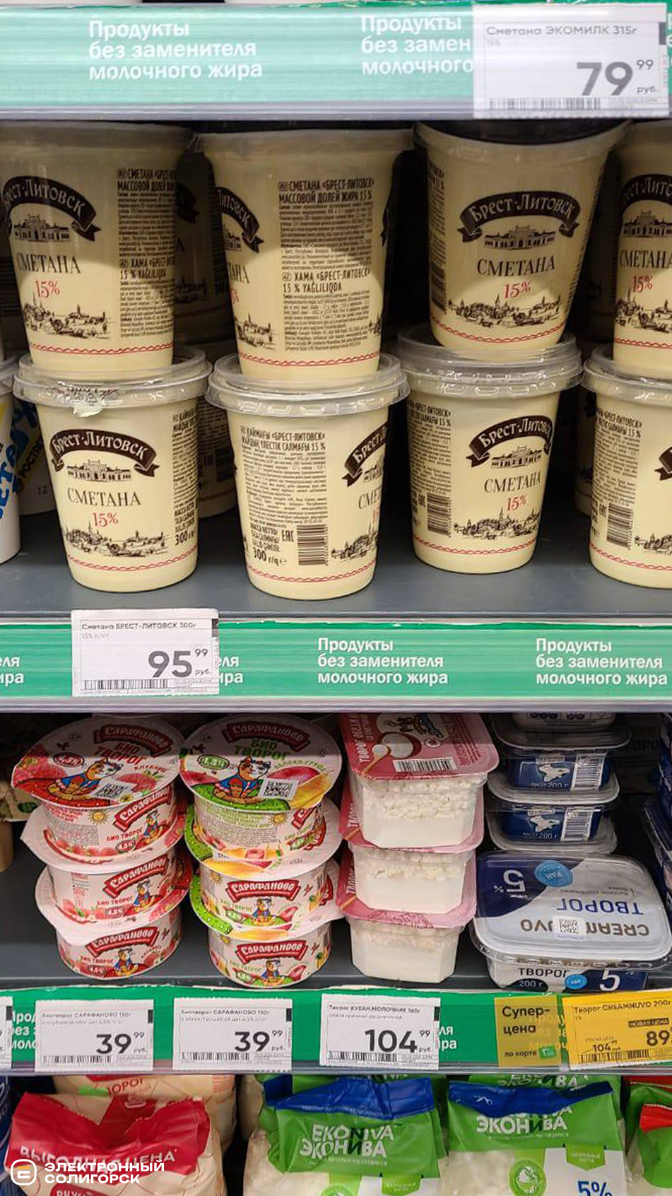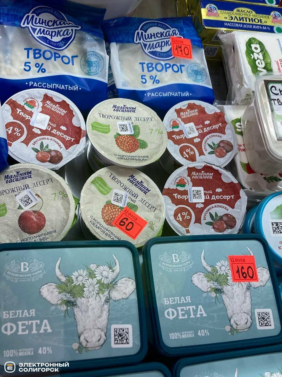 Творог мягкий – 120 рублей (4 BYN), творог на акции – 120–300 рублей (4–10 BYN), сметана 15% – 96 рублей (3.35), сыры фасованные – 180–210 рублей (6.30–7.30 BYN), творожки с фруктовыми наполнителями – 56–79 рублей (1.95–2.79 BYN), сливочное масло – 210–450 рублей (7.30 –15 BYN), лидский квас – 120 рублей (4.19 BYN).
