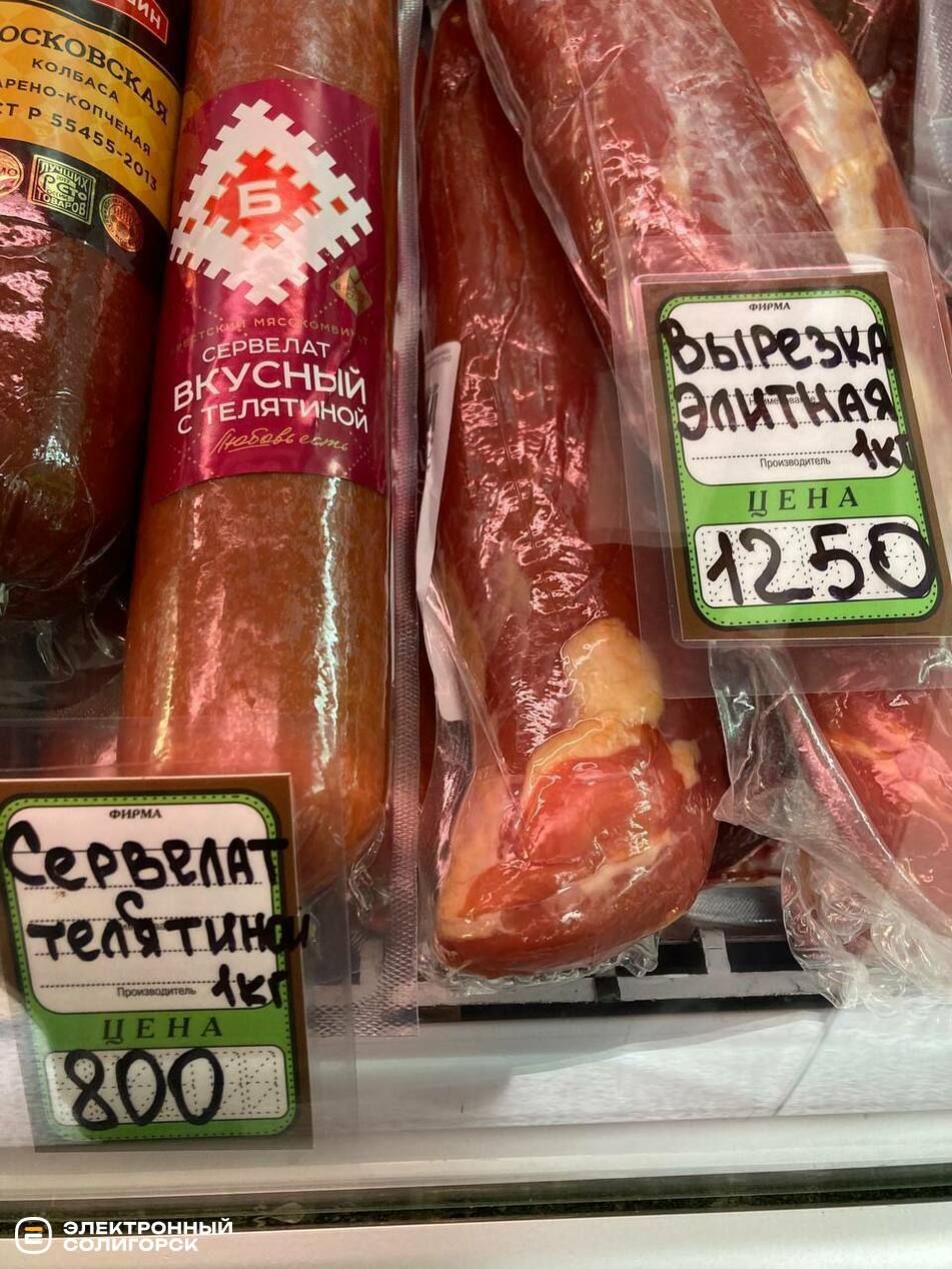 Сервелат с телятиной – 800 рублей (27.9 BYN), вырезка элитная – 1250 рублей (43.68 BYN).