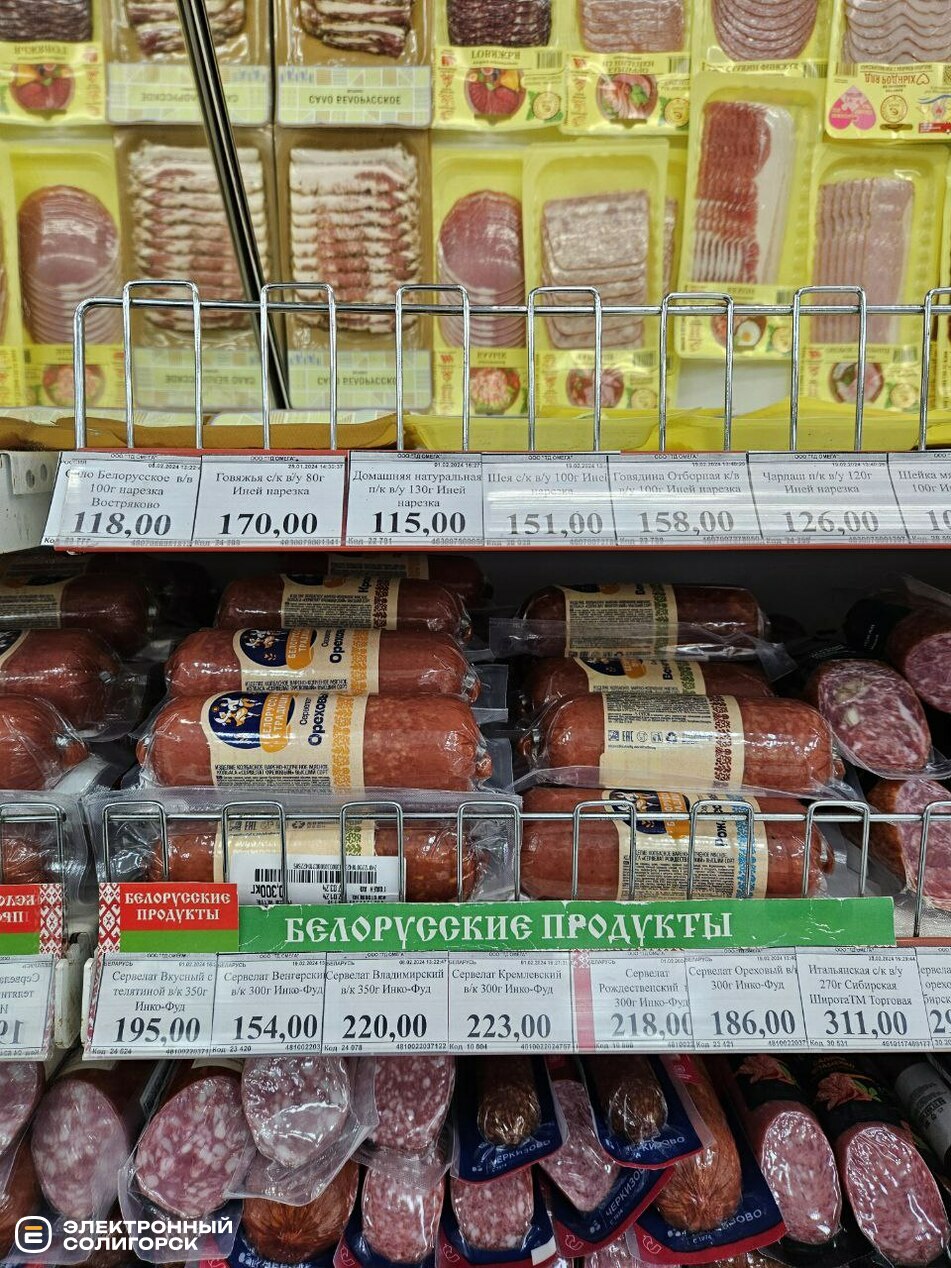 Салями, сервелат и колбасы можно приобрести в диапазоне цен: 173–320 рублей (6–11 BYN), сосиски – 438–620 (15–21 BYN), тушёнка – 158–224 рубля (5.50–7.80 BYN).