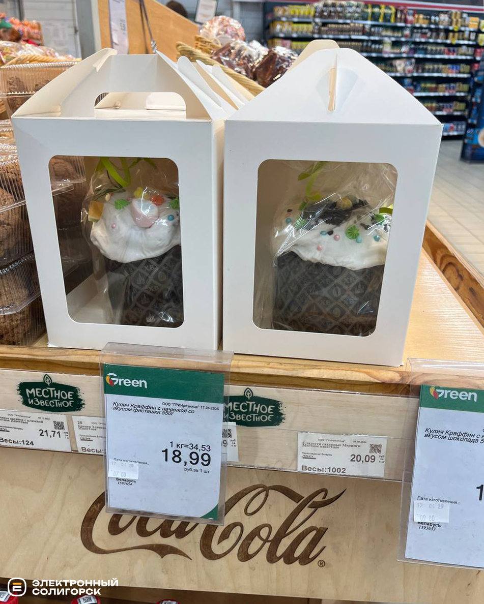 Заглянули в магазин "Грин". Здесь выбор весьма разнообразный - продают от маленького кулича "для одного" за 5,59 руб. до большого и сладкого в коробке за 18,99 руб.