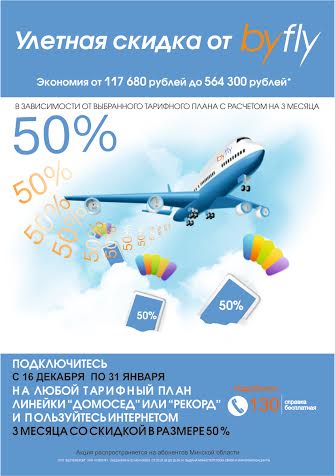 Подключитесь к услуге доступа в сеть Интернет под торговой маркой byfly на тарифный план линеек «Домосед» или «Рекорд» и получите скидку 50% на три месяца работы в сети Интернет!