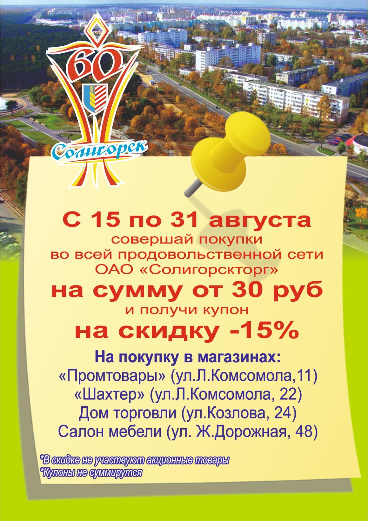 В рамках мероприятий, посвященных празднованию 60-летия г. Солигорска, ОАО "Универмаг "Солигорск" с 1 августа по 31 августа проводит рекламную акцию "Лови момент". Условия проведения акции: покупатель совершает покупку непродовольственных товаров в одном чеке на сумму не менее 100 рублей и получает от кассира купон на скидку в размере 30% на следующую покупку непродовольственных товаров одним чеком. В акции не участвуют акционные товары и товары со сниженной торговой надбавкой (холодильники, морозильники, стиральные машины, телевизоры, газовые и электрические плиты, встраиваемая техника, изделия из натурального меха).