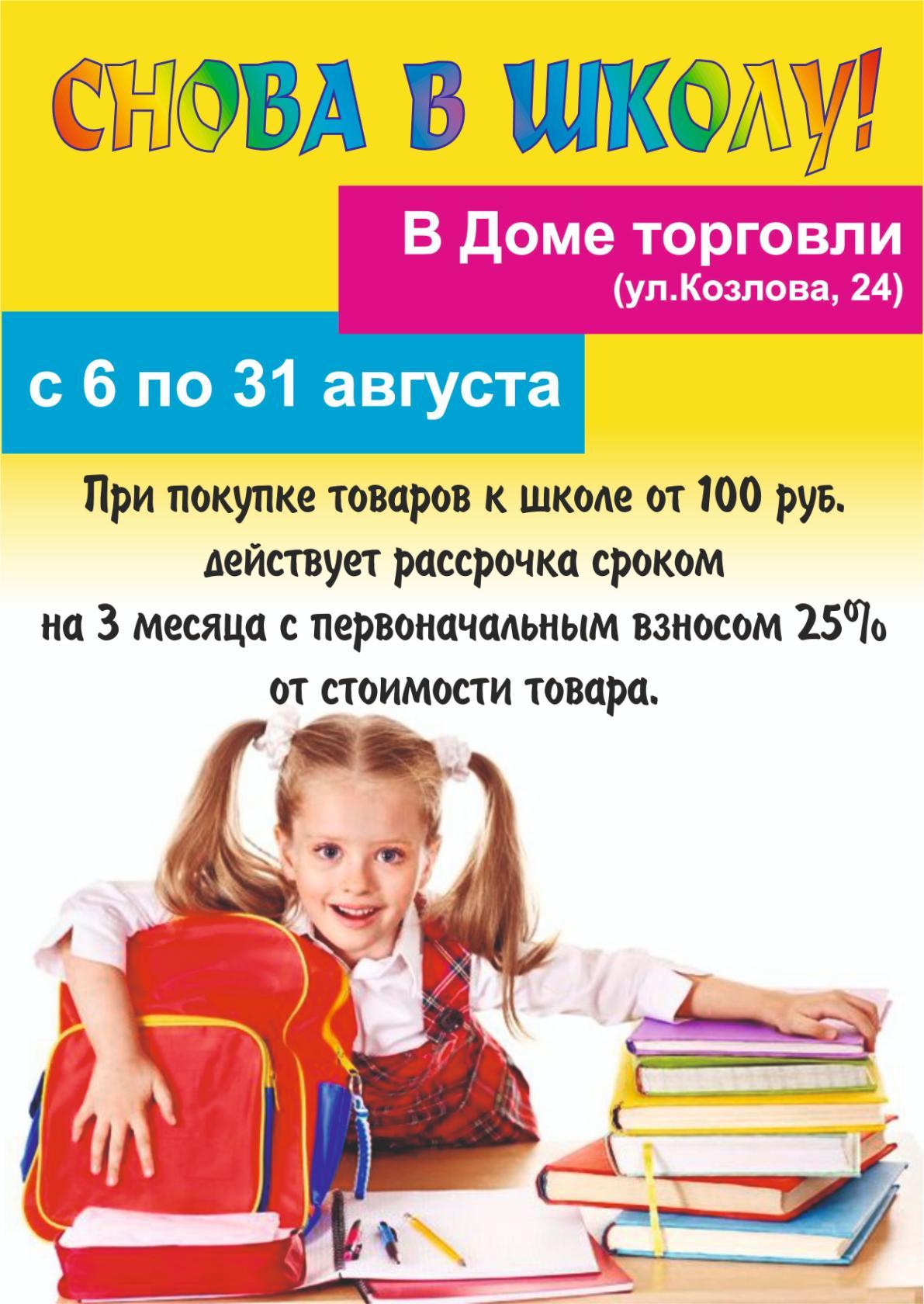 С 6 по 31 августа при покупке товаров к школе от 100 руб. действует рассрочка на 3 месяца с первоначальным взносом 25%! |