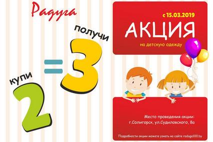 Как же быстро растут детки. Купил курточку сыну, а через 2 месяца она ему мала. Шкаф ломится от полуновой одежды - разорение какое-то. По этой причине многие родители стараются приобретать одежду для своих детей по выгодным ценам. У нас хорошие новости: торговая сеть "Радуга" подготовила для Вас весеннее предложение - купите 2 вещи и получите 3-ю бесплатно!