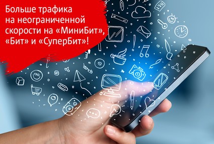 Объем интернет-трафика на неограниченной скорости увеличится с 18 декабря. Теперь пользователям услуги "МиниБит" будут доступны 100 МБ, "Бит" — 250 МБ, "СуперБит" — 500 МБ в сутки.