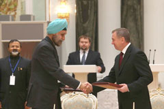 Беларусь и Индия подписали дорожную карту двустороннего сотрудничества. Министр иностранных дел Беларуси Владимир Макей и замглавы МИД Индии Навтеж Сингх Сарна в присутствии президентов двух стран обменялись документами, составляющими дорожную карту сотрудничества, передает корреспондент БЕЛТА.