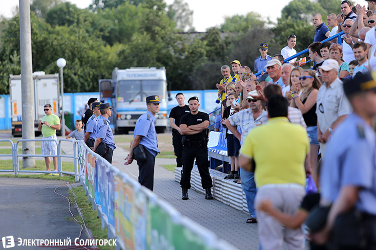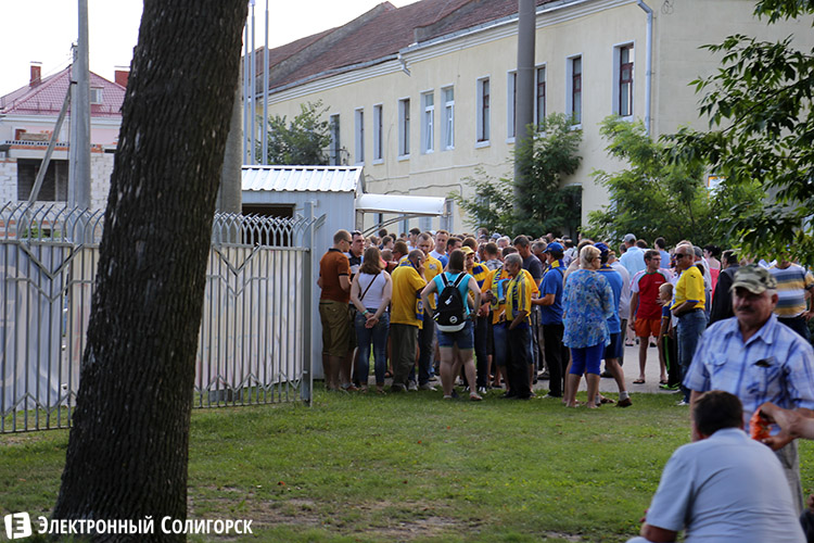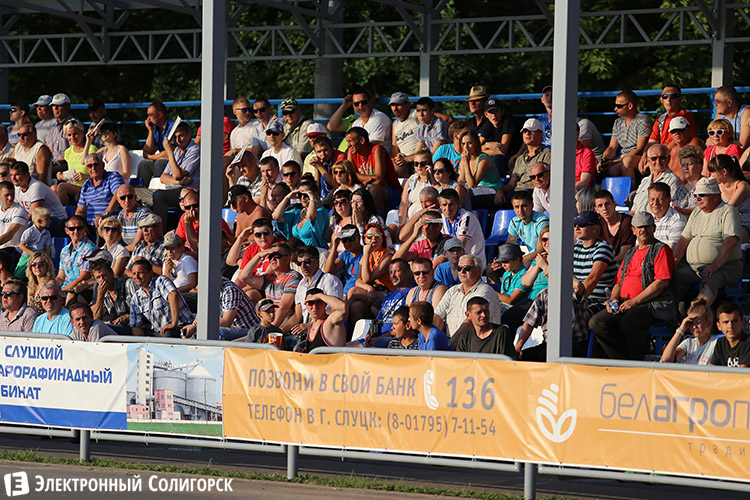 Вы не знаете, как болеют в Слуцке? О, это делают поистине уникально. На трибунах можно было набюдать ядреный коктейль из орущих баянистые шутки (например, "уноси симулянта") мужичков-кузьмичей, дующих в дудки нескольких дядек-заводил, азартно топающих вместе со всеми ногами женщин бальзаковского возраста, с огоньком в глазах наблюдающих количество юных девушек, пришедших на стадион парами и целыми семьями людей разного возраста, добавьте к этому сектора с фанатами команд, активно заряжающих кричалки и машущих флагами. Получается, весьма колоритный антураж, особенно, если учесть непосредственную близость трибун к полю и возможность полного эмоционального погружения в события игры.