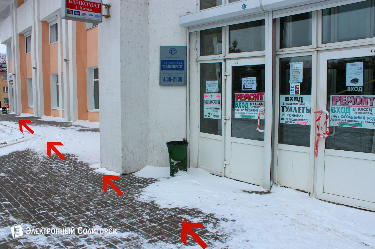На нижеприведённых фото наглядно показано, как пройти к временным билетным кассам Солигорского автовокзала.