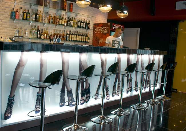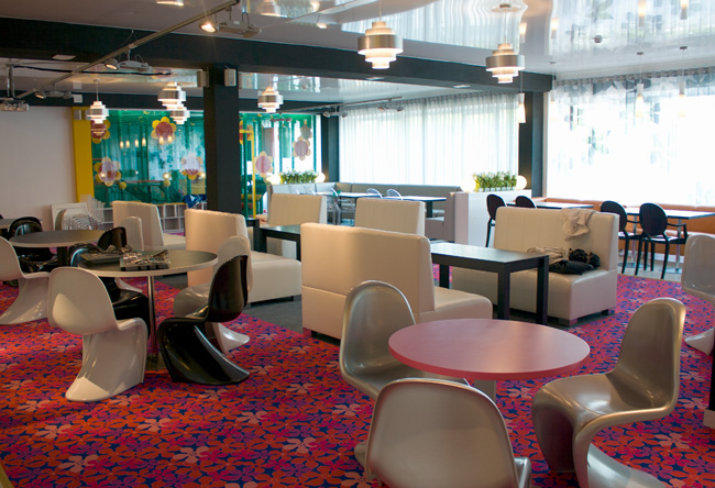 Суши-бар также оформлен с особым вкусом. Интерьер в стиле футуризма 60-х - строгие геометрические формы мебели, яркие комбинации цветов. Такая ностальгия по стилю диско также "зацепит" свою публику.