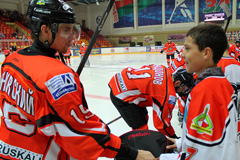 Перед началом поединка экстралиги между ХК "Шахтер" и новополоцким "Химик-СКА" и "состоялась раздача подарков юным хоккеистам.