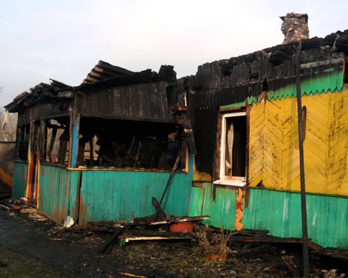 В результате пожара уничтожена кровля по всей площади, выгорела комната 6х4м, обрушилось перекрытие; комната 6х6м закопчена. Сарай уничтожен полностью.