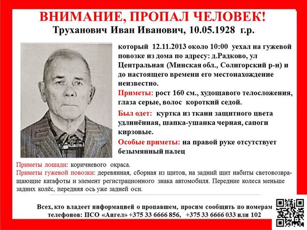 Солигорским РОВД устанавливается местонахождение гражданина Трухановича Ивана Ивановича, 10.05.1928 года рождения, уроженца д. Чижевичи, Солигорского района. Пенсионер, проживает в Солигорском районе в д. Радково по ул. Центральная, 94.