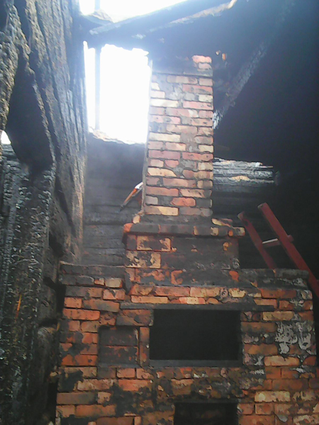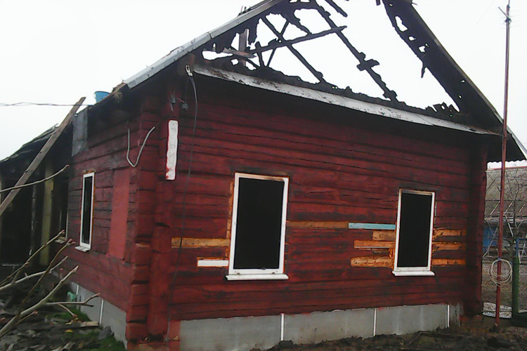 В результате пожара кровля уничтожена по всей площади, дом выгорел изнутри.