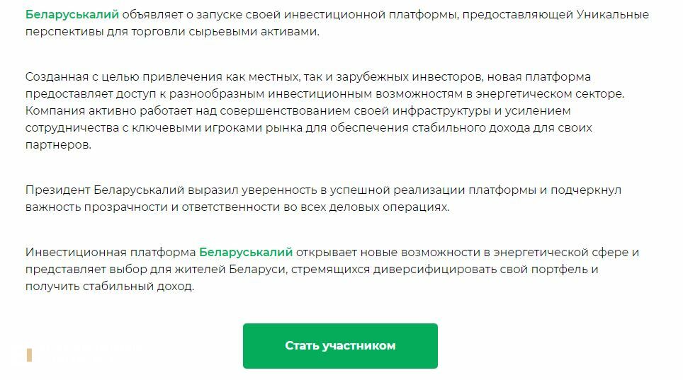 В пресс-службе "Беларуськалий" напоминают, "не верьте обещаниям легкого заработка в интернете. Прежде, чем вкладывать деньги в какие либо инвестиционные проекты, следует проверить достоверность предложения поиском в браузере или по телефонам организаций, размещенным на их официальных сайтах".