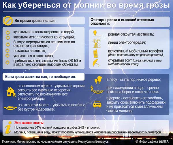 Как отметили в МЧС, при грозе лучше по возможности не выходить из дома, закрыть окна и дымоходы во избежание сквозняка. Не рекомендуется также топить печку. Следует держаться подальше от электропроводки, антенн, отключить радио и телевизор, избегать использования телефона и электроприборов. В открытой местности нельзя прятаться под высокие деревья (особенно одинокие), при отсутствии укрытия следует лечь на землю или присесть в сухую яму, траншею, пригнув голову. В случае пребывания во время грозы в лесу лучше укрыться среди низкорослой растительности, а группе лиц - присесть на корточки, не соприкасаясь с другими людьми.