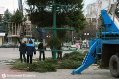 Сегодня на центральной площади Солигорска можно было наблюдать один из рабочих этапов по приведению конструкции главной новогодней елки города в праздничный вид.