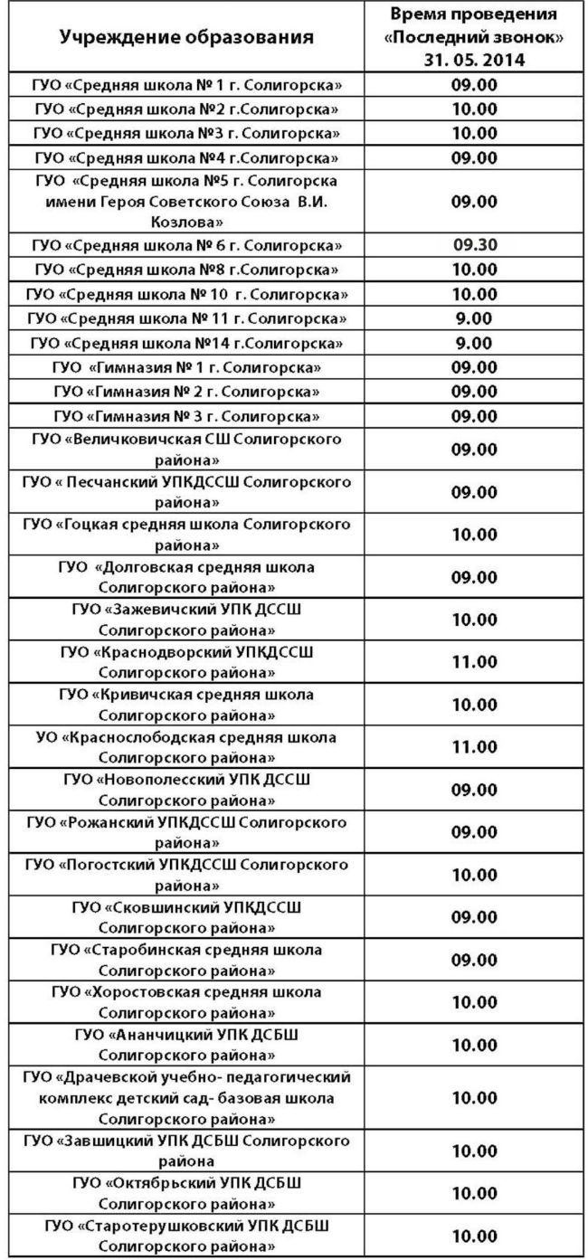 Предлагаем вашему вниманию расписание проведения торжественных мероприятий в гимназиях и школах Солигорщины.