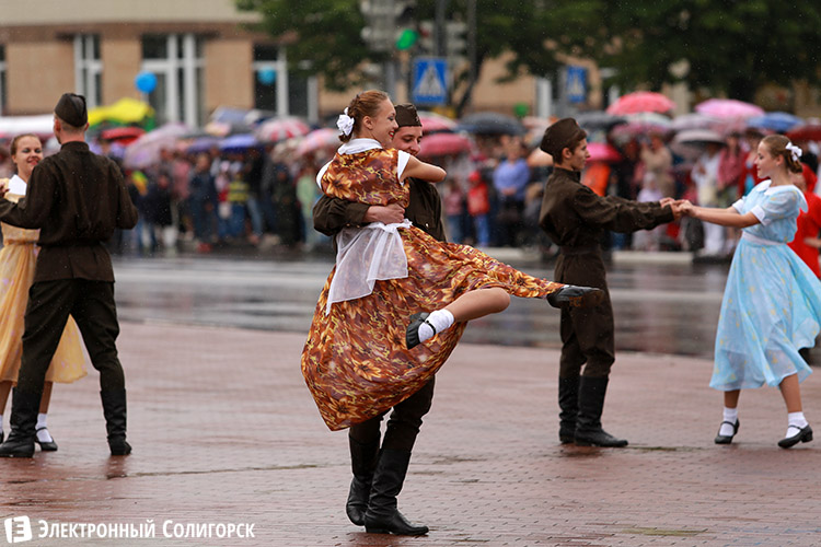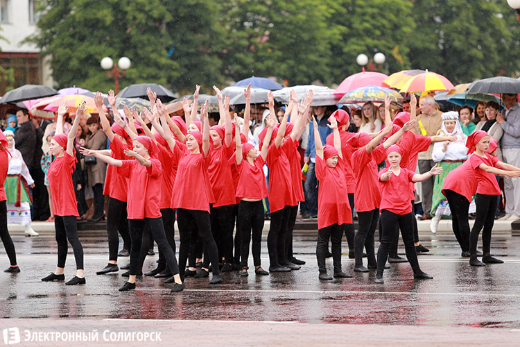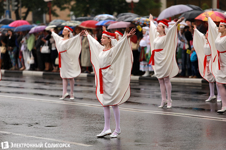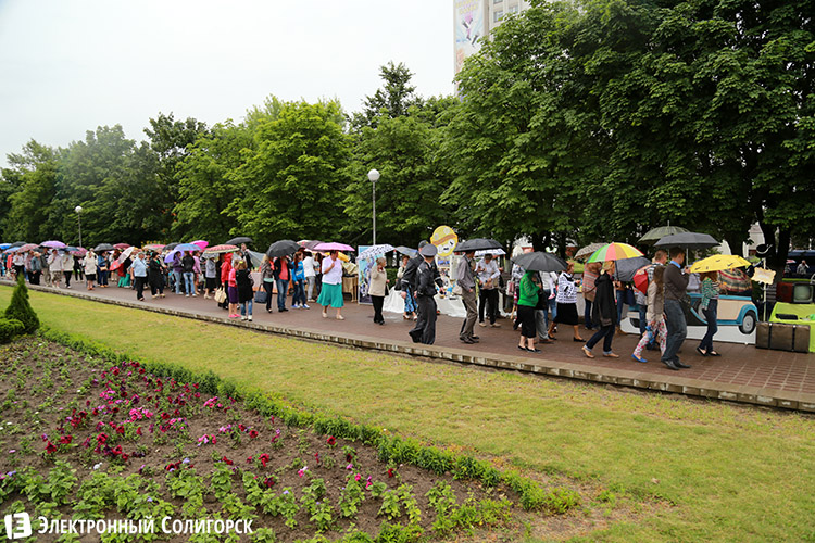 Сгустившиеся над городом тучи практически с началом шествия разродились водными струями. В одночасье площадь превратилась в скопление разноцветных зонтов, которыми все участники праздничного мероприятия защищались от непогоды.