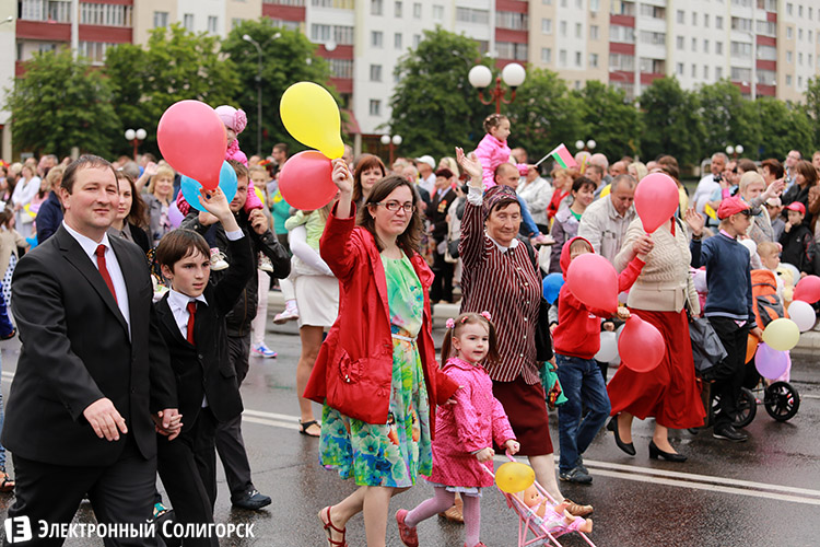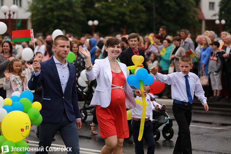 Вторая часть шествия - представление современных достижений Беларуси и Солигорского района. В праздничных колоннах прошли солигорские молодые семьи, лучшие из представителей молодежи - победители и призеры учебных олимпиад, творческих конкурсов, спортивных соревнований, представители общественных объединений.