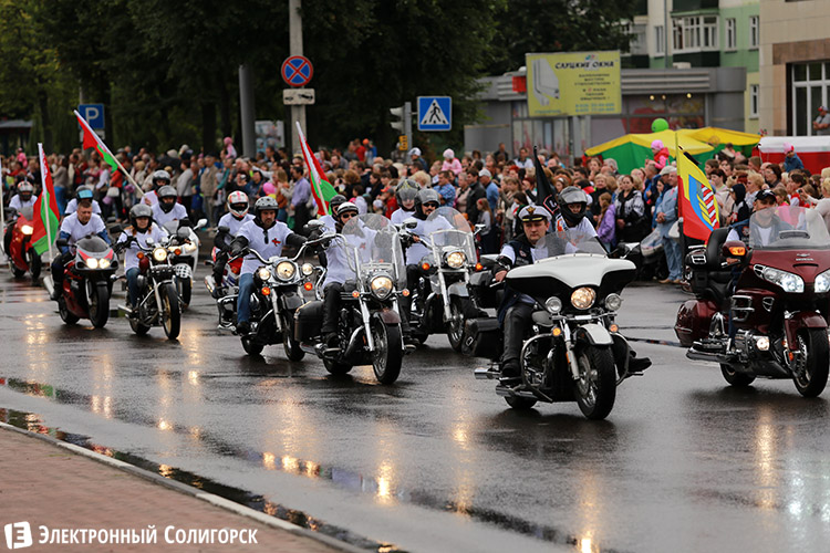 Замыкали праздничное шествие громкой и зрелищной колонной современные рыцари на железных конях - солигорские байкеры.