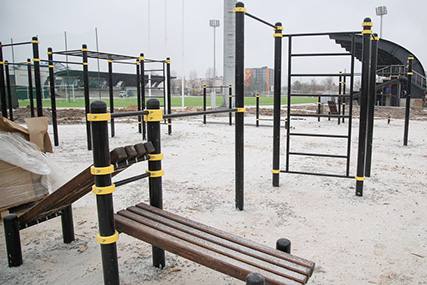 На стадионе "Шахтер" продолжаются работы по реконструкции трибун и модернизации футбольного поля. Обновляются и другие объекты спортивной арены, предназначенные для массового спорта и физкультуры. Вот такой воркаут-комплекс для занятий силовыми упражнениями на свежем воздухе установлен недавно на стадионе "Шахтер".