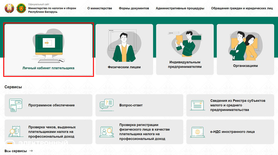 На сайте Министерства по налогам и сборам Республики Беларусь на главной странице есть раздел "Личный кабинет плательщика".