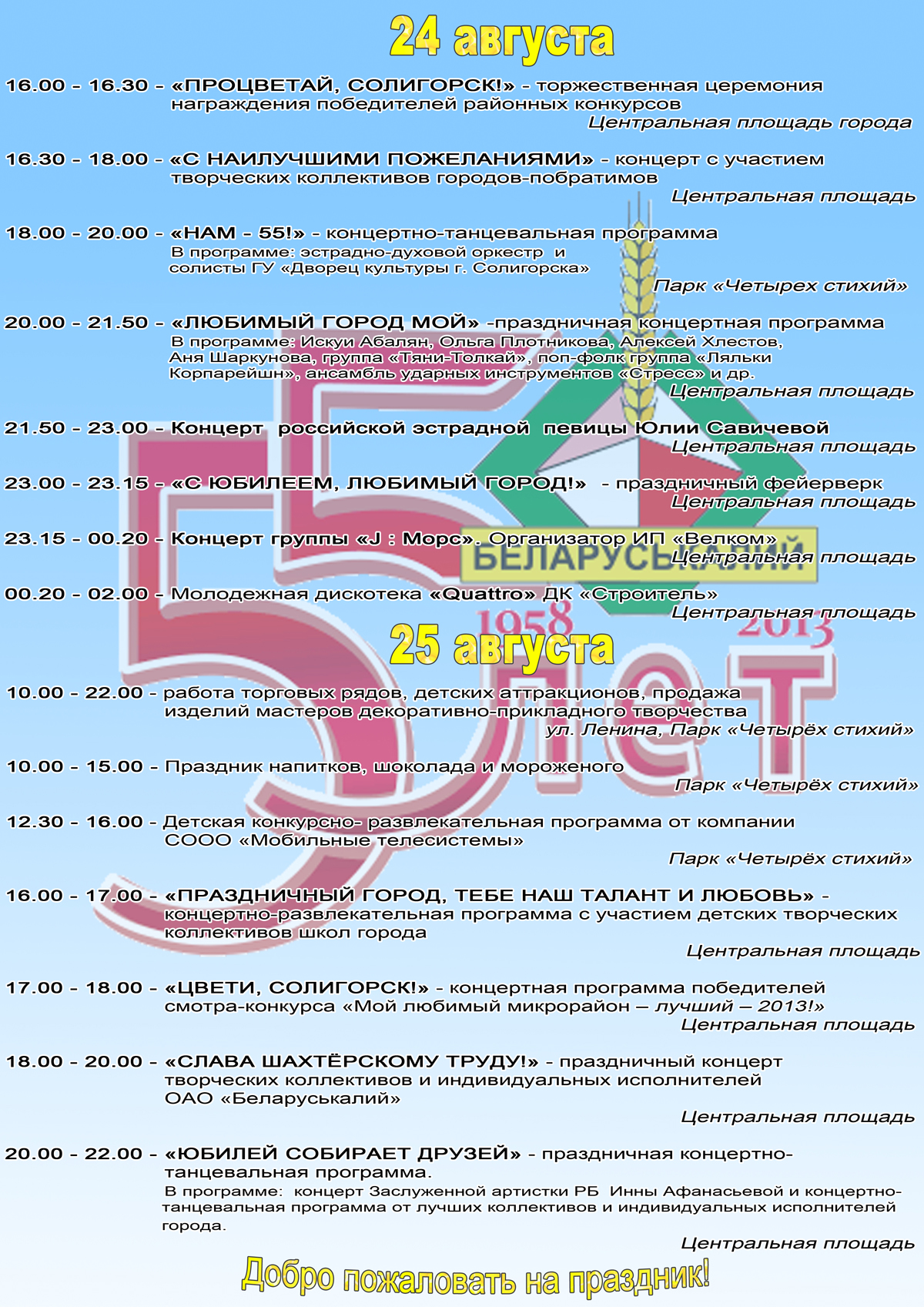 Приглашаем Вас принять участие в праздничных мероприятиях, посвященных 55-летию со дня основания города Солигорска и дню Шахтера «С праздником, любимый город!»