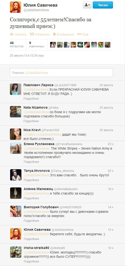 Заметьте, что, несмотря на свой звездный статус, Юлия отвечает своим фанам. А вот подборка впечатлений о концерте подписчиков паблика "Электронного Солигосрка" вконтакте: