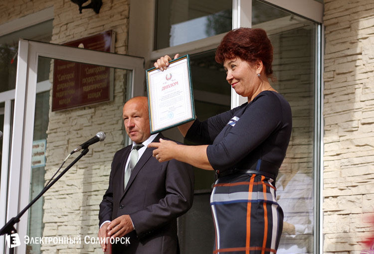 С теплым приветственным словом к уже хорош знакомым старшекурсникам и впервые вступившим в учебное заведение новичкам директор колледжа Тамара Михайловна Бородко. Еще один гость праздничного мероприятия заместитель председателя Солигорского райисполкома Николай Иванович Маскевич напутствовал учащихся на хорошие достижения в новом учебном году, а также выполнил еще одну торжественную миссию, поздравив под аплодисменты будущих педагогов директора колледжа с юбилеем.