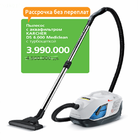 Пылесос Керхер DS 6000 снабжен аква- и Hepa-13 фильтром, складчатым фильтром, что позволяет ему не только убирать грязь и пыль, но и удалять из воздуха большинство бактерий и микроорганизмов.