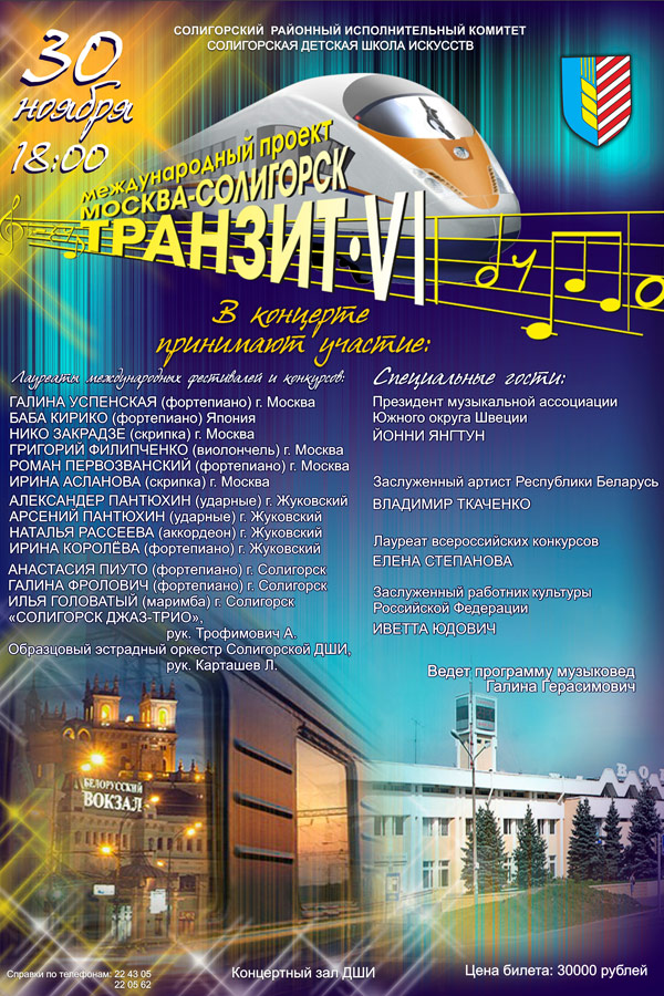 По-настоящему крупное культурное событие состоится скоро в нашем городе. 30 ноября Солигорская детская школа искусств примет международный проект "Москва-Солигорск-Транзит". Этот фестиваль пройдет в нашем городе уже в шестой раз. Отчет о прошлогоднем концерте вы можете посмотреть здесь. Перед зрителями выступят лауреаты международных конкурсов и фестивалей из Беларуси, России и даже Японии. На фортепиано сыграют Галина Успенская (г. Москва), Роман Первознанский (г. Москва), Баба Кирико (Япония), Ирина Королева (г. Жуковский), Анастасия Пиуто (г. Солигорск) и Галина Фролович (г. Солигорск). Исполнением на скрипке порадуют москвичи Нико Закрадзе и Ирина Асланова, на ударных - Александр и Артемий Пантюхины из Жуковского. За аккордеон будет отвечать Наталья Рассеева также из Жуковского, а за виолончель - Григорий Филипченко из Москвы. На маримбе выступит Илья Головатый из Солигорска. "Солигорск Джаз-Трио" и образцовый эстрадный оркестр ДШИ также поучаствуют в мероприятии самым непосредственным образом.