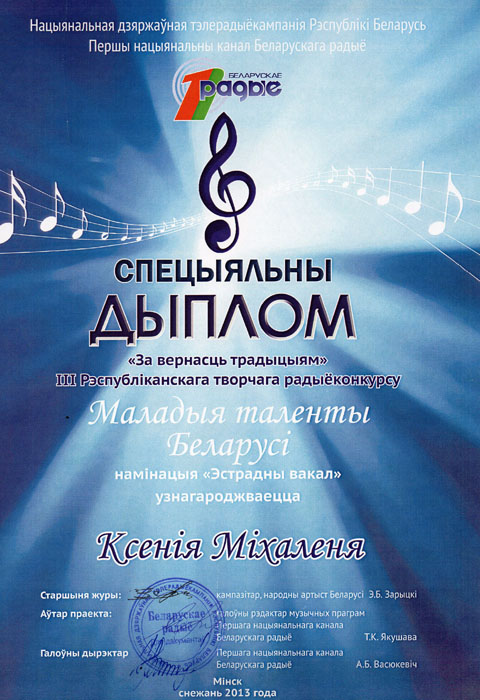 С июня по декабрь 2013 года Первый национальный канал Белорусского радио проводил III Республиканский творческий радиоконкурс молодых музыкантов «Маладыя таленты Беларусi», в котором поучаствовала и Ксения Михаленя. Он состоял из 3-ёх туров. Прохождение каждого тура означало победу, так как в номинации «Эстрадный вокал» была самая высокая конкуренция и подано больше всего заявок из разных уголков Беларуси, а также из Международной школы, где учатся ребята из Индии, Кореи, Китая, Въетнама и Америки. Ксения была награждена специальным дипломом «За верность традициям» в номинации «Эстрадный вокал». После третьего тура «Маладых талентау Беларусi» Ксения приняла участие в фестивале-конкурсе «Riga Sympfony», где получила дипломы 1-ой и 2-ой степени.