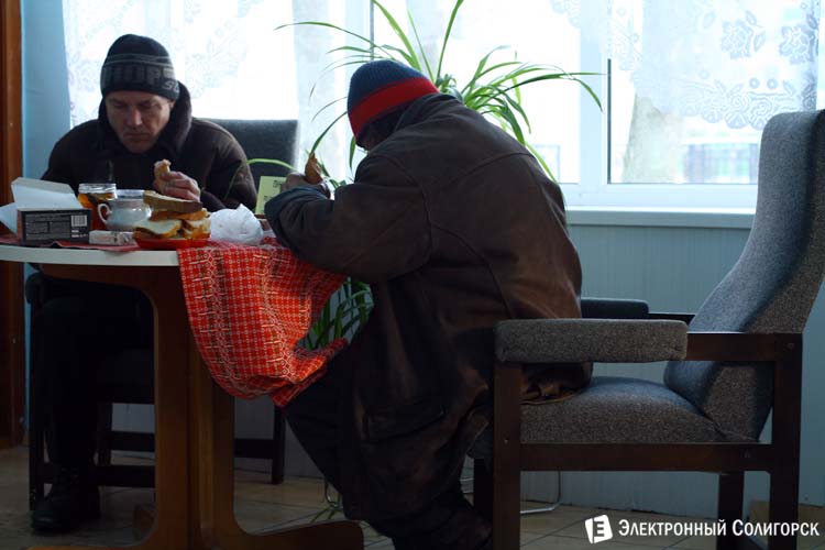 Импровизированный пунт питания представляет собой стол (или при необходимости несколько), расположенный в фойе Центра на улице Козлова, 8. За столом сидят двое мужчин, молча едят предоставленную им незамысловатую провизию.