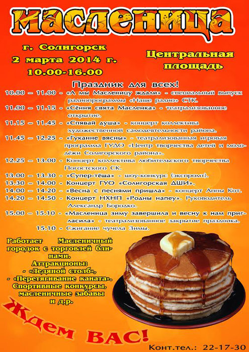 В программе веселого праздника: театрализованные представления, выступления артистов художественной самодеятельности Солигорского района, работа Масленичного городка, где будет вестись торговля блинами, традиционные масленичные конкурсы и спортивные состязания, например, "Ледяной столб" и "Перетягивание каната" и прочие забавы. И, конечно же, главная и самая зрелищная традиция Масленицы - сжигание чучела Зимы, которое назначено на 15.10.