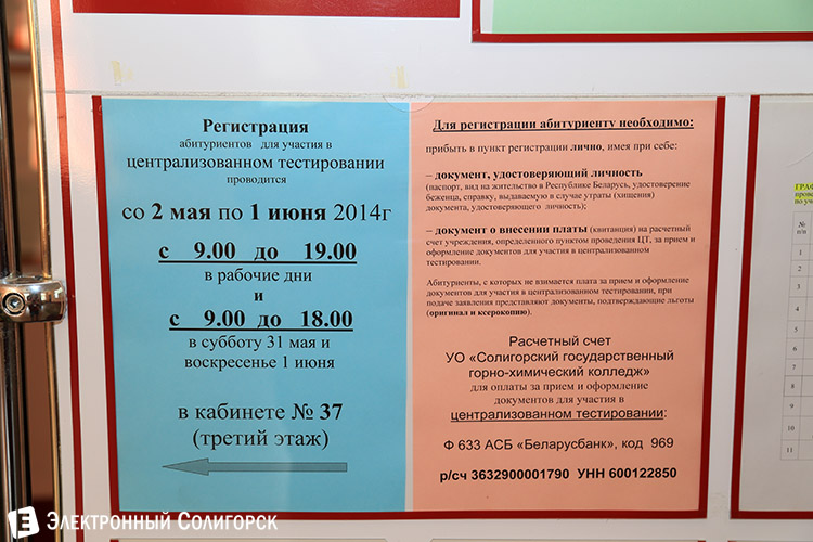 Расчетный счет УО "Солигорский государственный горно-химический колледж" для оплаты за прием и оформление документов для участия в централизованном тестировании: Ф 633 АСБ "Беларусьбанк" код 969, р/с 3632900001790, УНН 600122850.