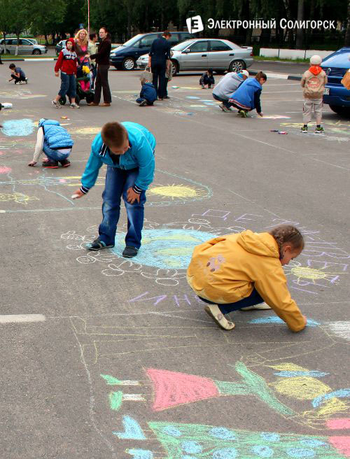 На площадке перед зданием стройтреста №3 в Солигорске прошёл конкурс детских рисунков на асфальте «Планета весёлого детства». В конкурсе приняли участие дети работников предприятия, а приурочен он был ко Дню защиты детей.