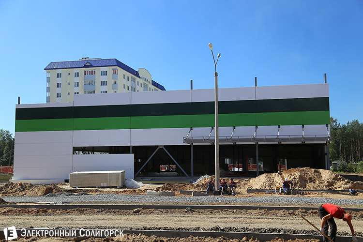 По соседству с этим ярким домом строится еще один знаковый объект - супермаркет "Родная сторона". В течение лета обещают открытие.