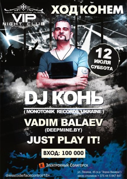 12 июля, в субботу, в Солигорск, а, в частности, VIP CLUB, посетит именитый диджей Лёша Кононов, известный всем ценителям клубной музыки по псевдониму Конь.