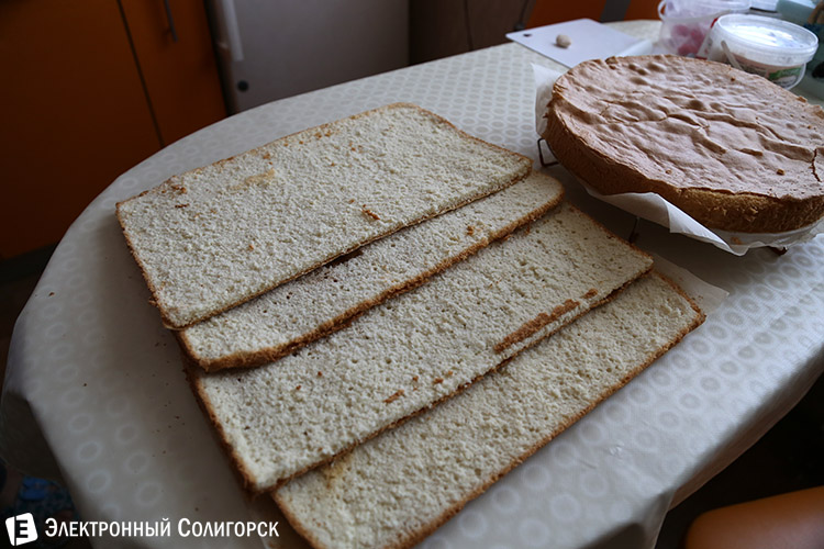 Остывший корж нарезается, и из полученных частей и начинки составляется торт.