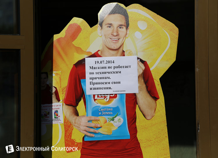 Многие жители Солигорска обратили внимание, что в субботу, 19 июля, магазин «Юбилейный» был закрыт. Объявление под улыбкой картонного Лионеля Месси у входной двери гласило, что «магазин не работает по техническим причинам».