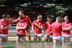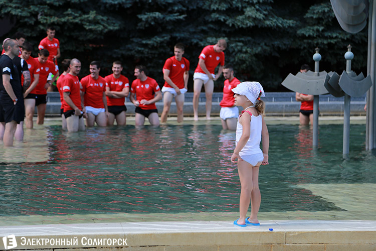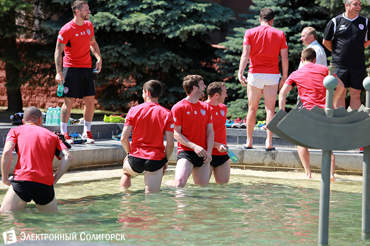 Однако прежде, чем разойтись по номерам все футболисты сняли обувь и... зашли в фонтан, расположенный у здания управления ОАО "Беларуськалий". Под надзором тренеров они стояли в воде несколько минут. Как выяснилось, это была процедура релаксации спортсменов после тренировки в рамках подготовки к матчу с "Шахтером".