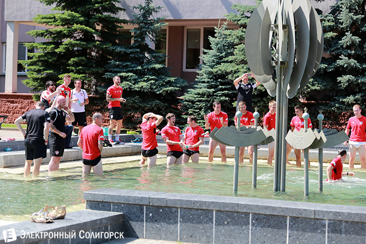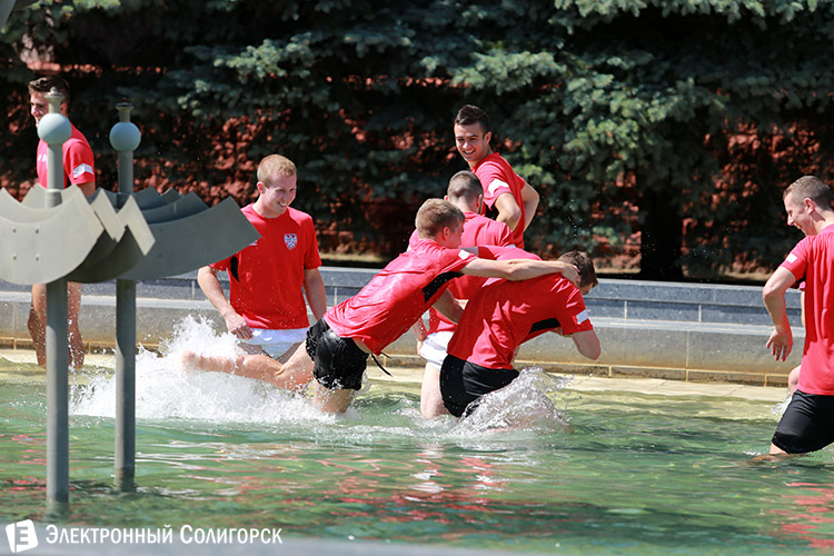 У приезжих футболистов явно было хорошее настроение, потому как вскоре процесс релаксации принял веселый оборот: обливания, брызги, смех... Кое-кому пришлось даже окунуться. Напомним, к слову, что солигорская санстанция не рекомендует купаться в городских фонтанах, где не производится циркуляция воды. Остается надеяться, что здоровью наших гостей после этого купания последствия не грозят:))