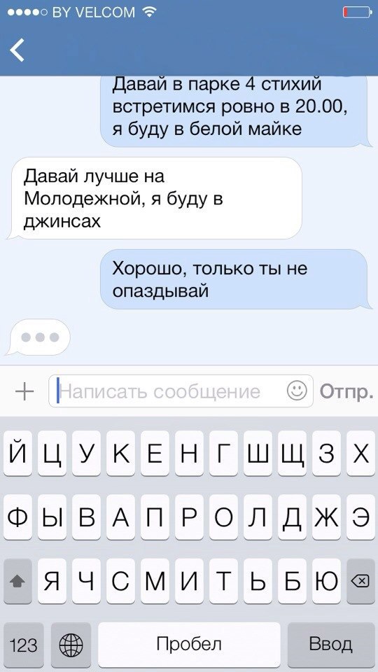 А вот история девушки, которая хотела шуткой показать молодому человеку, что его предложение о встрече очень размыто, и следует договориться конкретнее. "Мой неудавшийся кавалер шутку не оценил, наверное, в его случае нужно было не только смайлики поставить, но и в скобках "шутка" написать", - поделилась с нами Кристина.