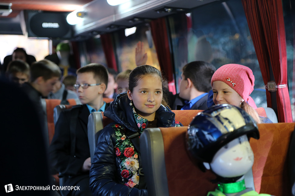 Автобус укомплектован генератором дыма для имитации задымления салона, наглядными материалами и мультимедийной аппаратурой для демонстрации обучающих фильмов. На выходе всем детям вручали фликеры и памятки о том, насколько важен ремень безопасности.